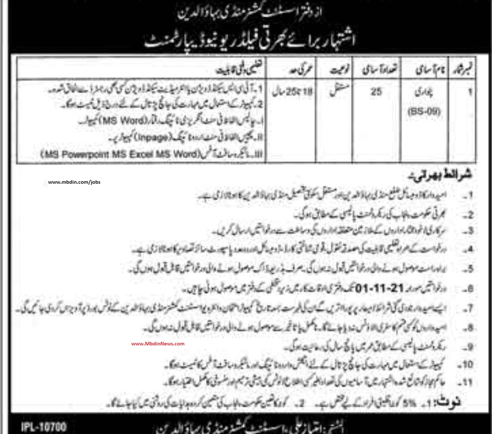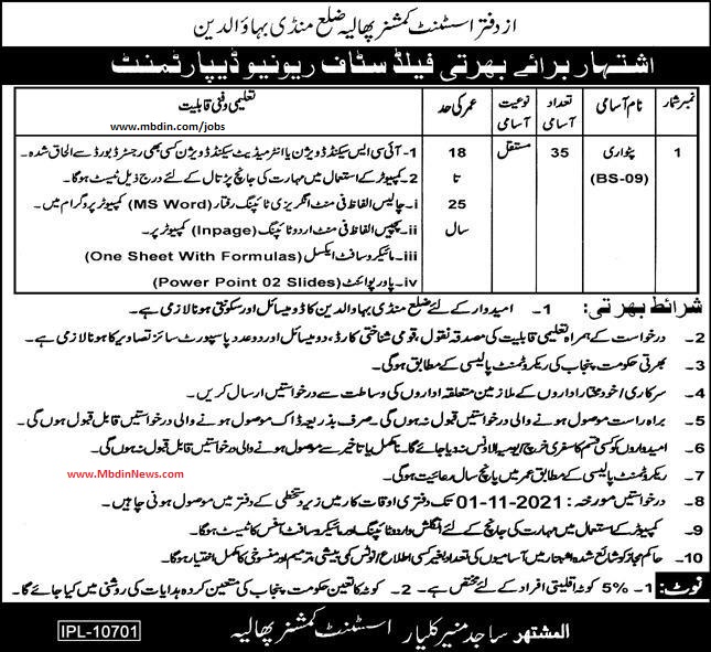 Applications received after the due date will not be entertained. Latest Revenue Department Jobs. You can also see Latest International Jobs on this site. Applications either incomplete or received after the due date will not be entertained. New Government Jobs in Mandi Bahauldin. Details are as under.